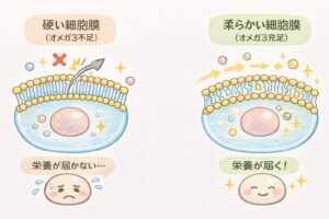 その細胞を守る膜が「細胞膜」であり、その柔軟性と機能性を左右するのが脂肪酸の質です。